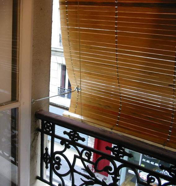 Ce store en bois enroulable se manoeuvre par cordons, il est ici équipé de bras de projection, et de bloqueurs anti-vent.