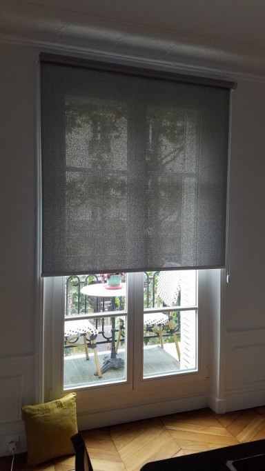 Pour ce store intérieur à enroulement à chaînette, la toile Soltis 99 permet à la fois de réduire la chaleur et de conserver la vue sur l'extérieur.