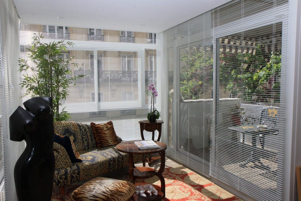 Le stores ont ici la fonction de claustra décoratif, ils protègent un espace cosy, les lames en aluminium apportent une touche de modernité.